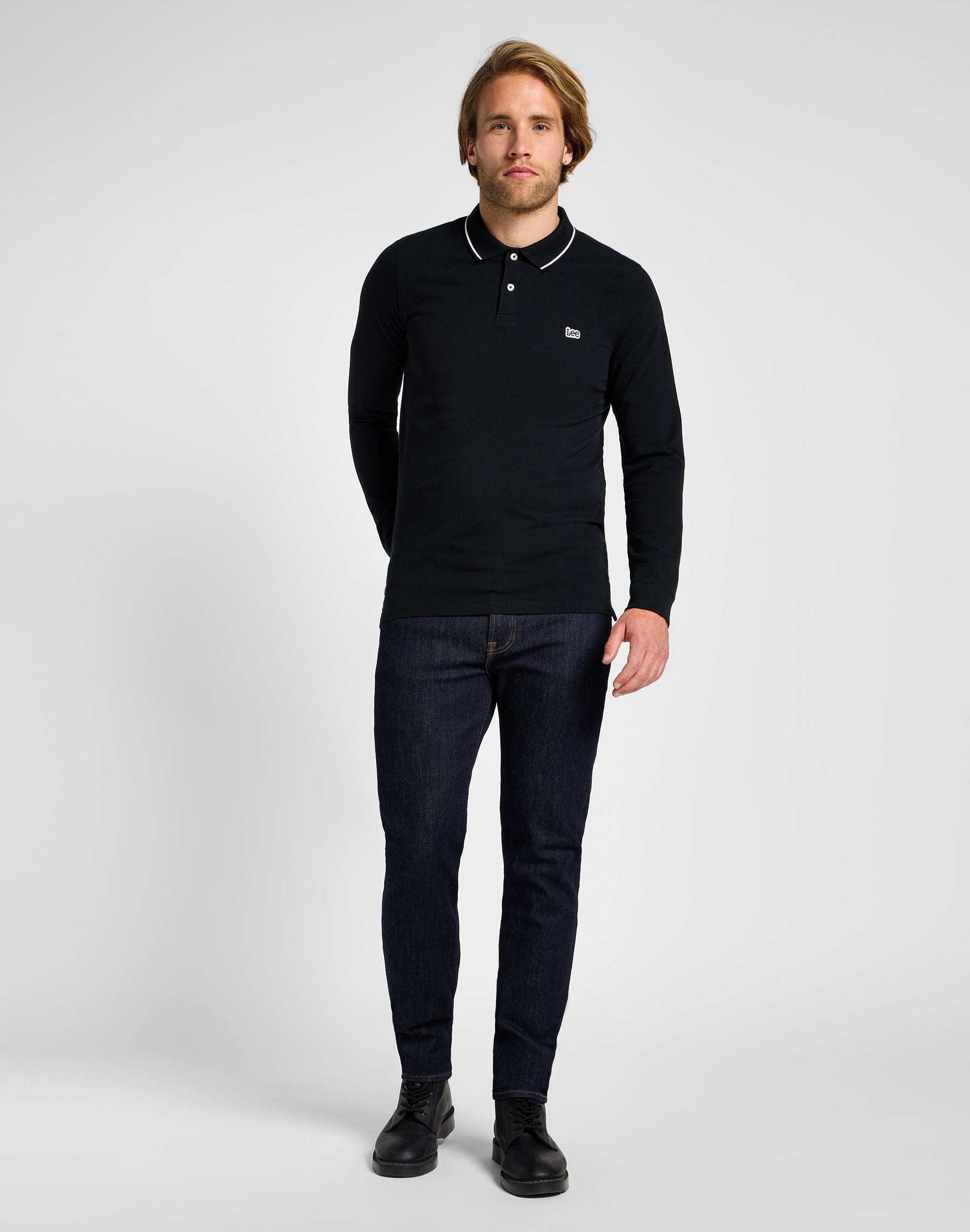 Our smart casual piqué polo shirt is featured here with long sleeves and a versatile regular fit.